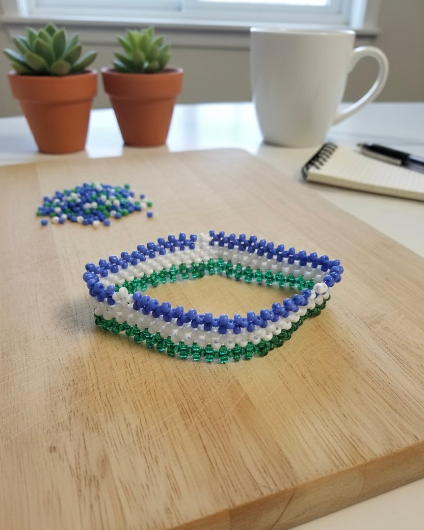 Deze prachtige handgemaakte armband is geïnspireerd op de kleuren van de Somalische regionale vlaggen. De armband is zorgvuldig geweven met kleine glaskralen in blauw, wit en groen, wat symbool staat voor eenheid, cultuur en trots.