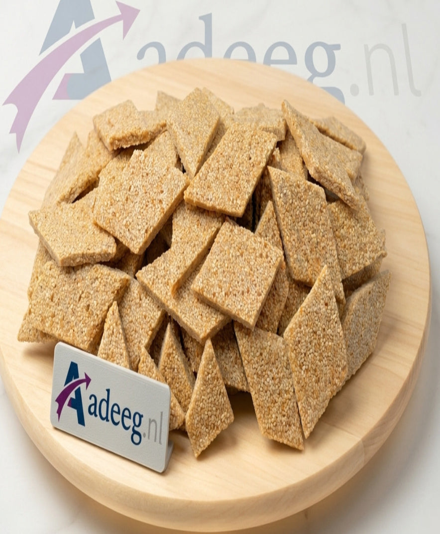 Geniet van deze heerlijk knapperige sesam reepjes, perfect als tussendoortje of bij de borrel. Deze goudbruine crackers zijn rijkelijk bedekt met sesamzaadjes, wat zorgt voor een volle, nootachtige smaak en een aangename crunch bij elke hap.